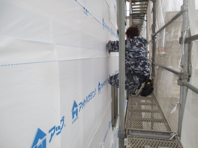 外部の防水透湿シートの施工を行ってます☆*:.。. o(≧▽≦)o .。.:*☆