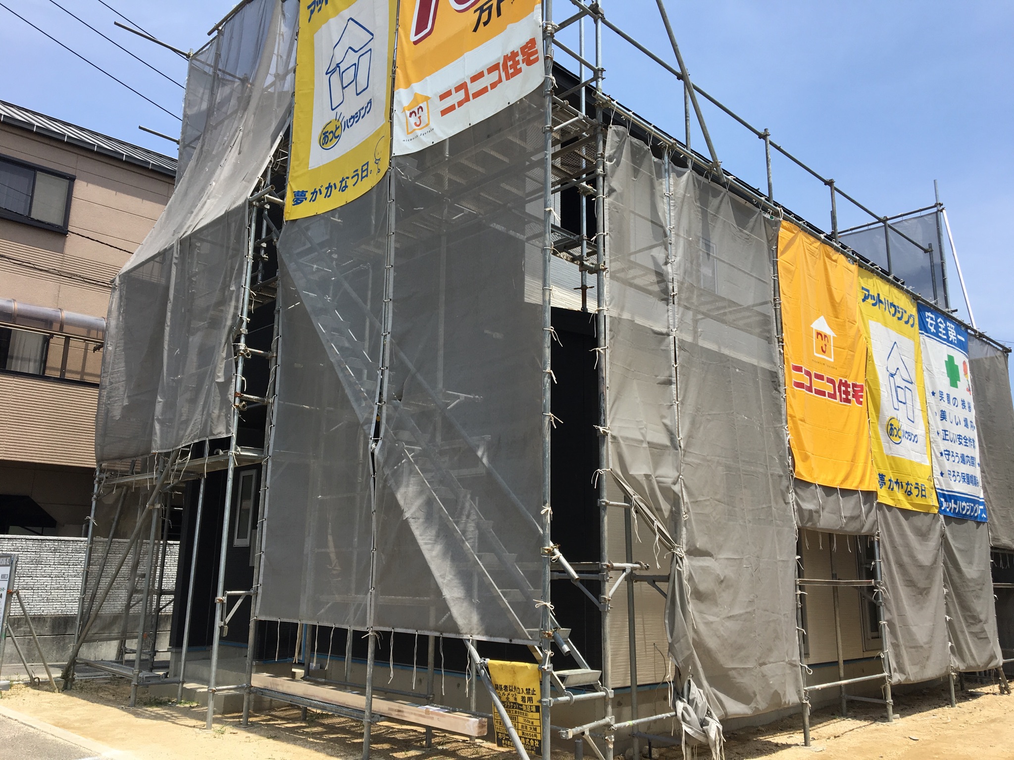 外壁が張り終わって黒と白のかっこいい外観が見れました![]()