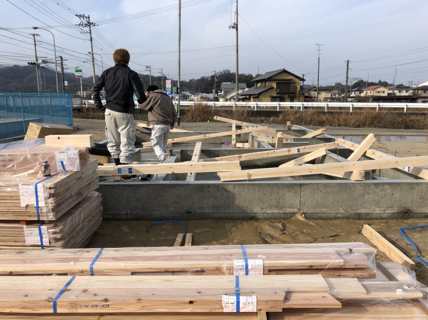 夕方には土台敷き工事も終わっていました(o^^o)