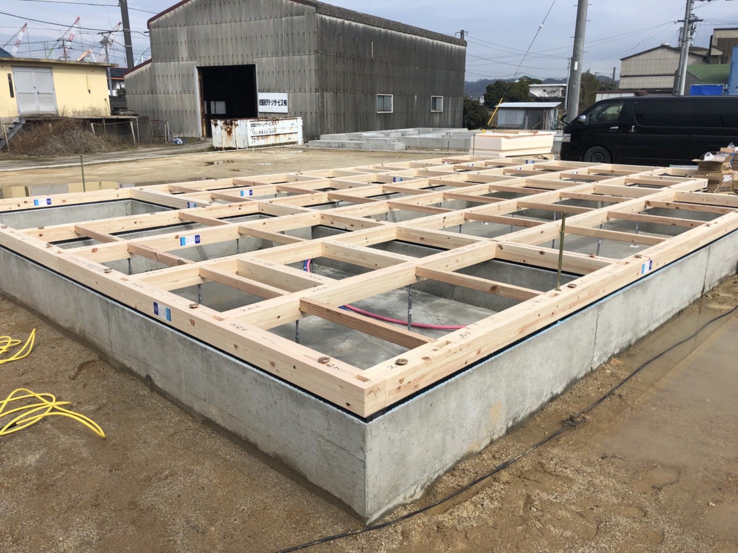 朝から尾崎大工さんにて土台敷き工事を行ってくれています(๑>◡<๑)