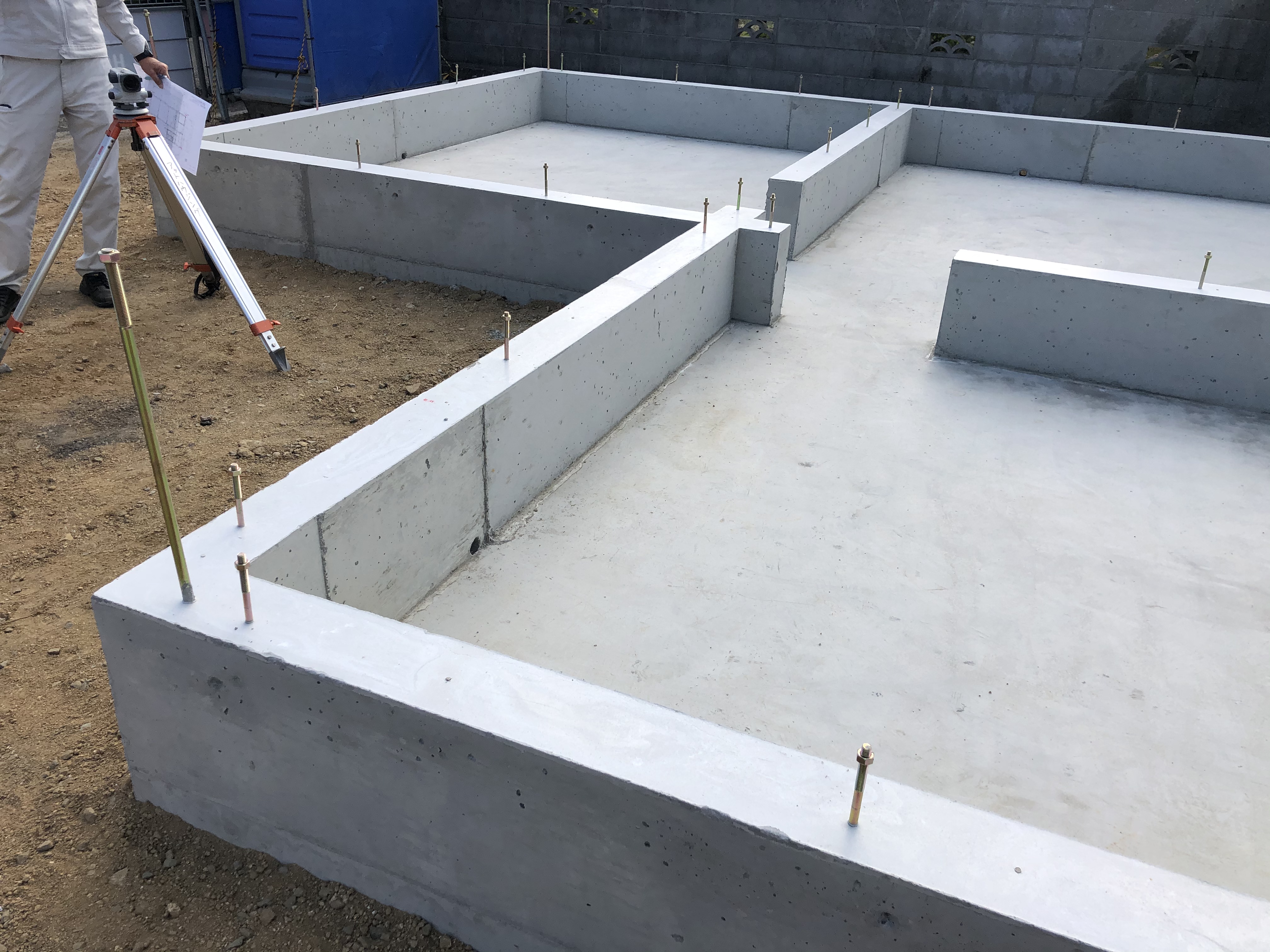 営業担当と現場監督が、基礎がきちんと水平にできあがったかどうかを機材を使って調べます(`・ω・´)