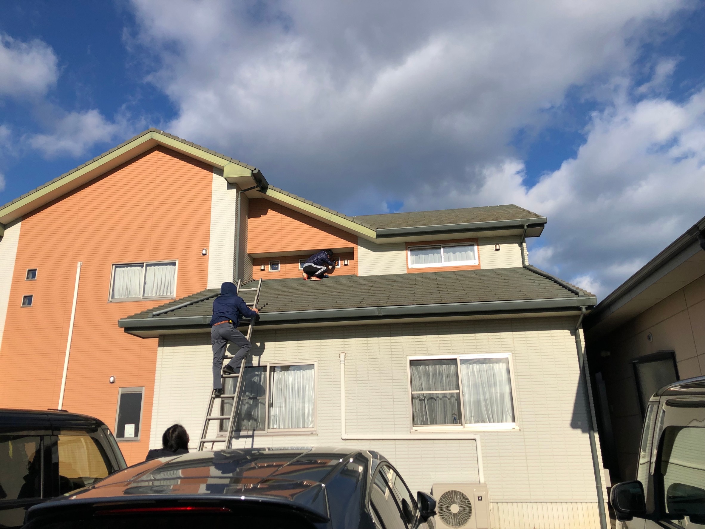 (写真は屋根に上がって掃除をする僕です、怖かったです、、、)