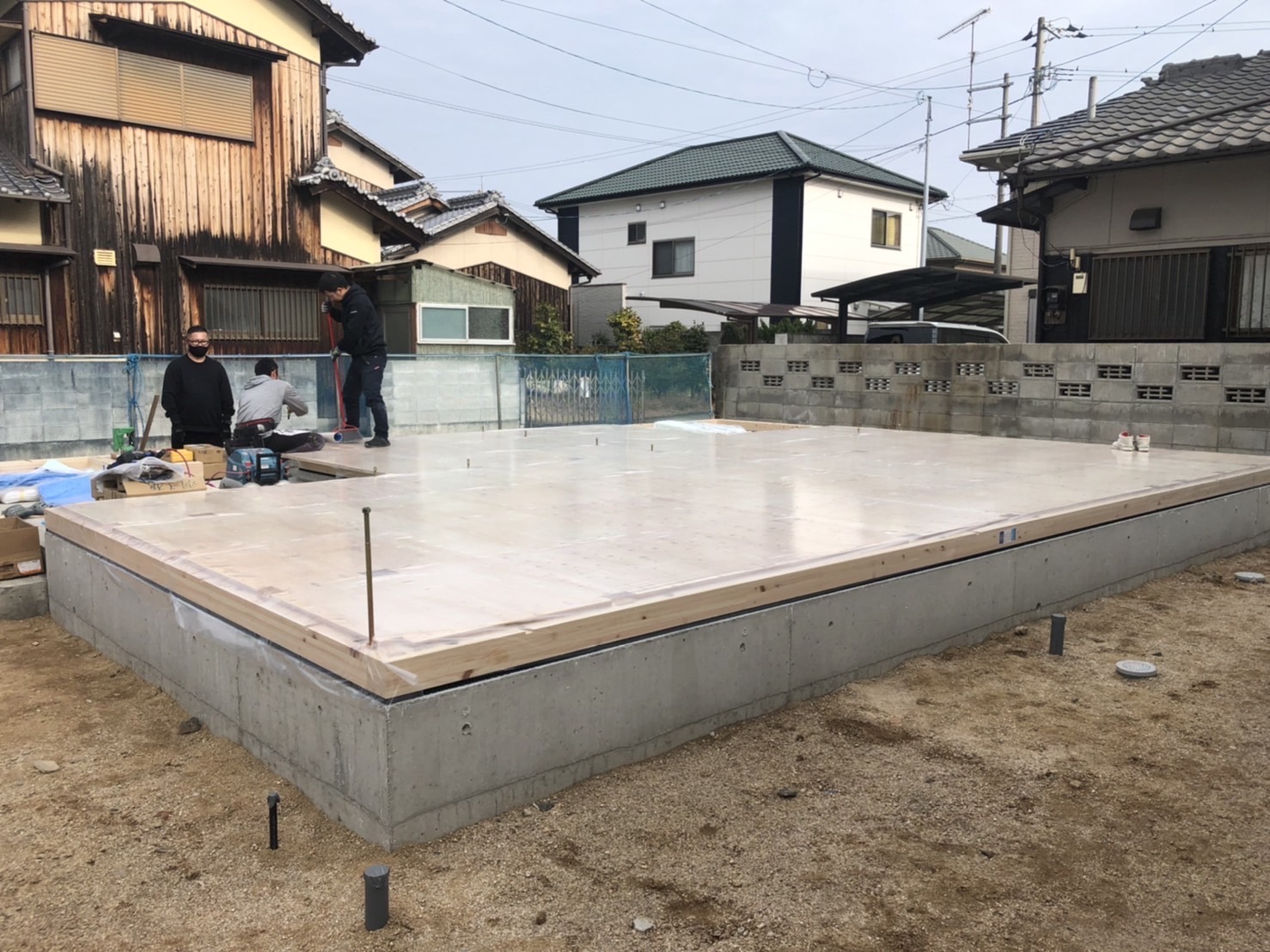 月末の上棟に向けて基礎工事、土台敷きも完了しました(^^♪