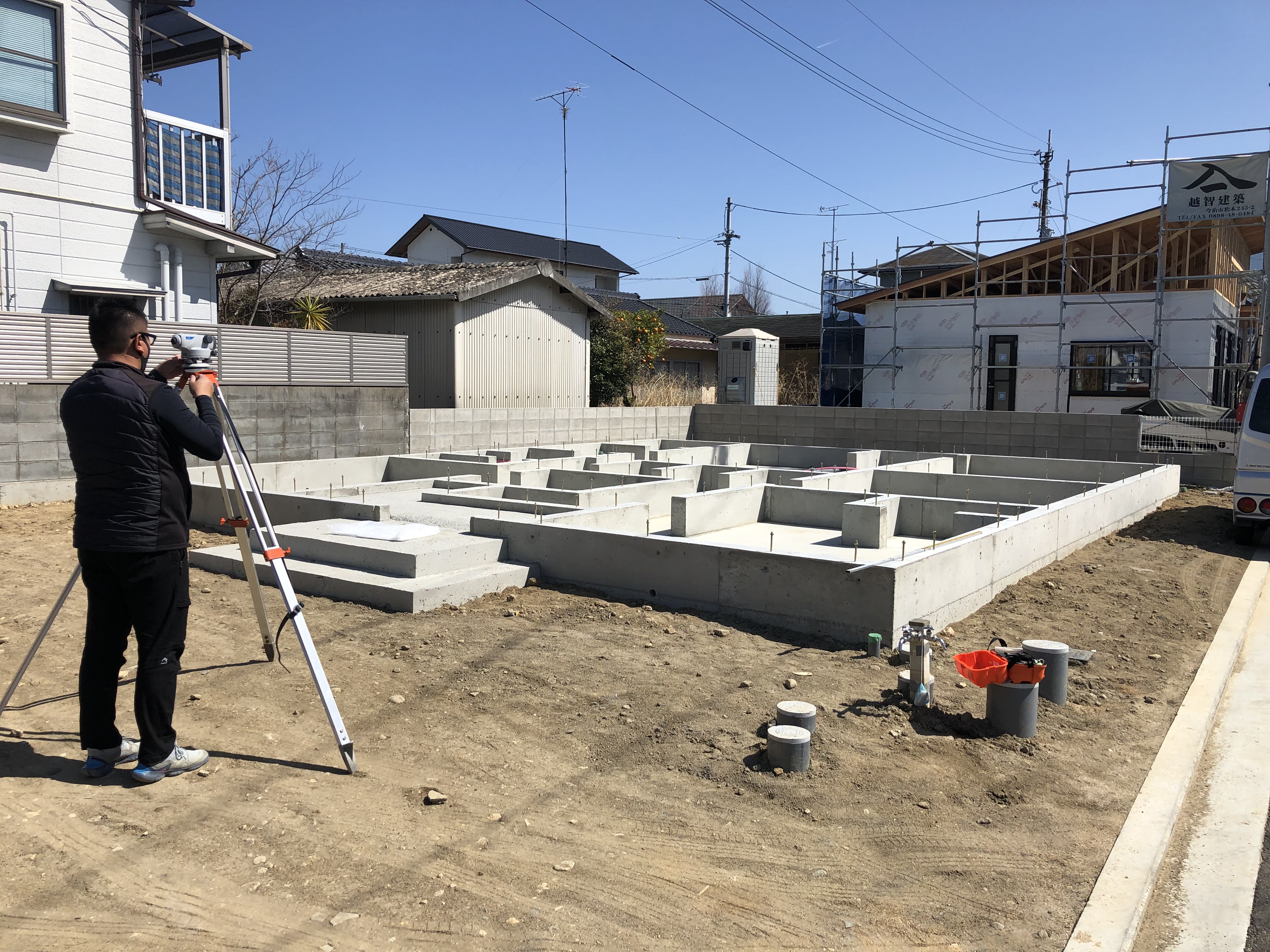 現場監督と一緒にレベルチェックを行い、基礎の高さが均一になっているか確認いたしました(`・ω・´)