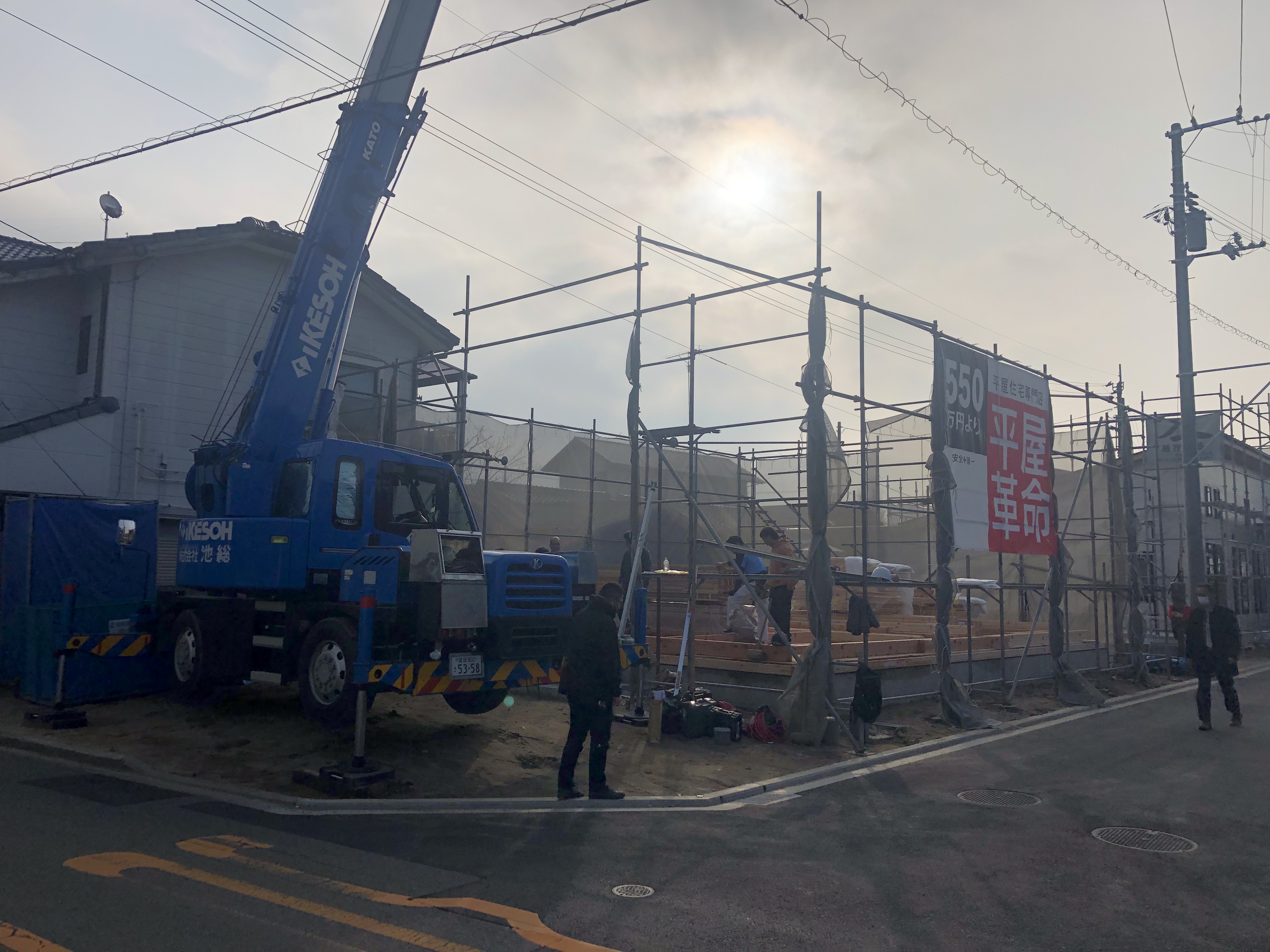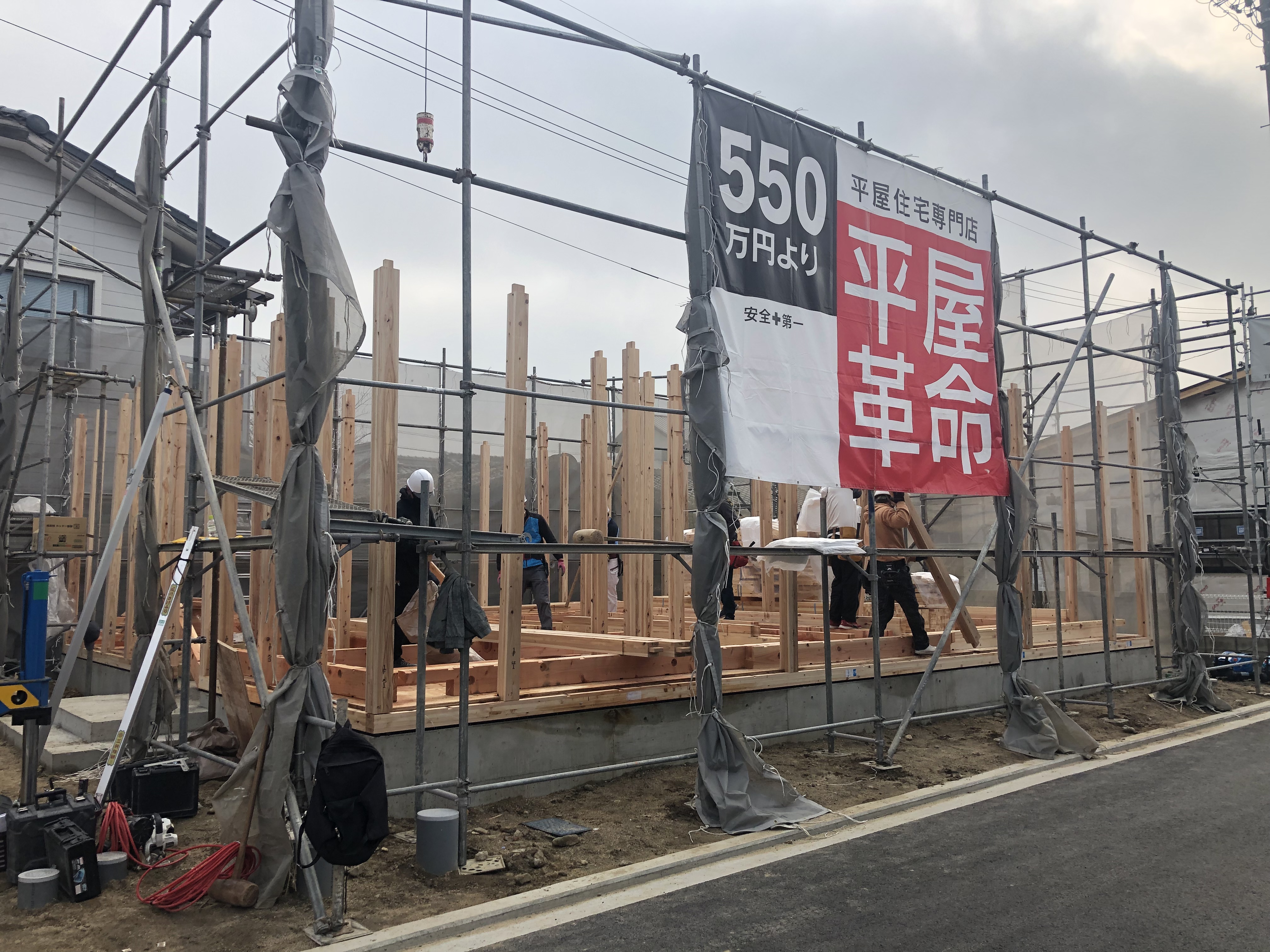 今治市郷本町にて工事中の平屋モデルが本日上棟いたしました(^o^)/